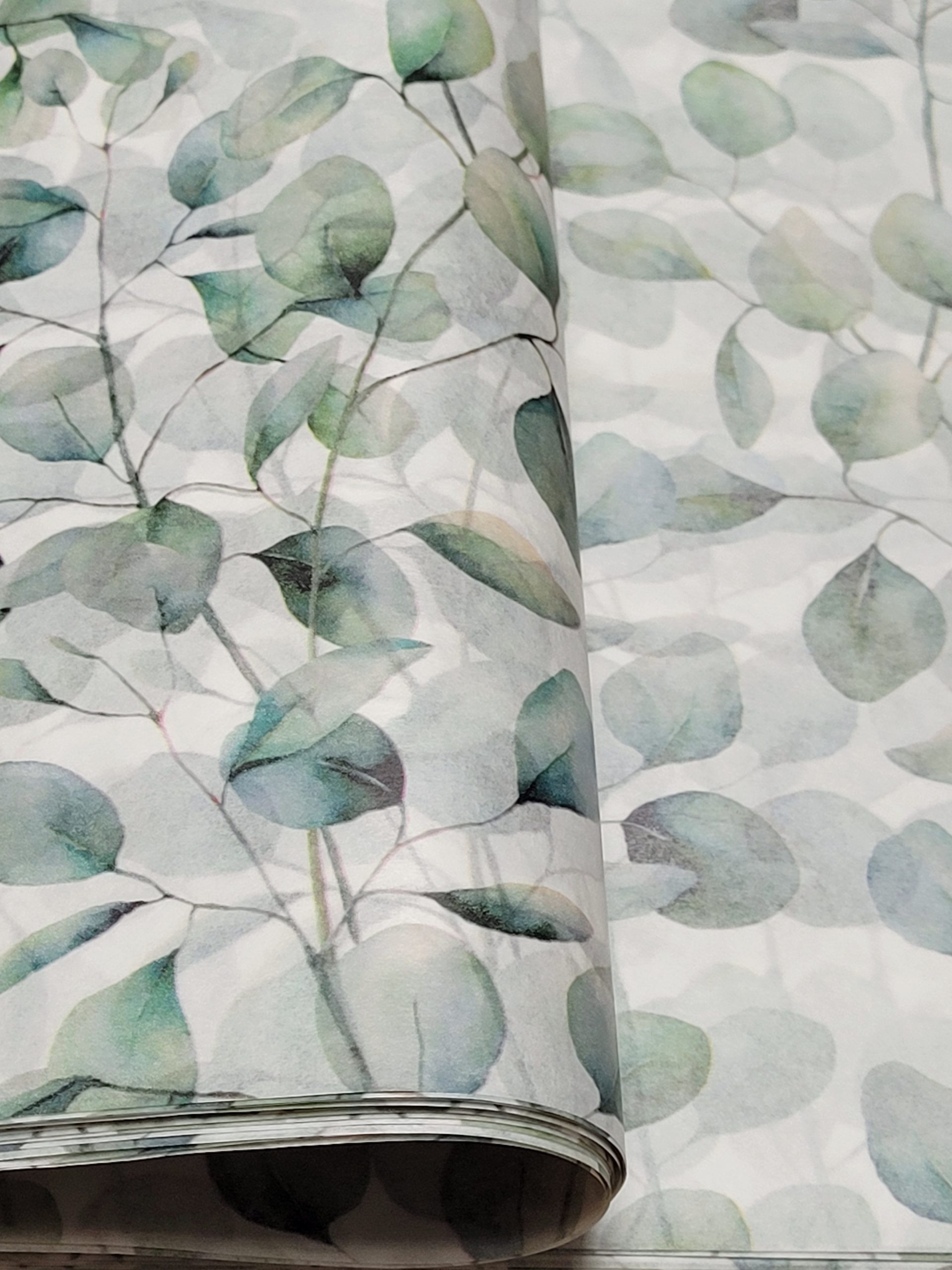 Svilen papir v beli barvi s potiskom vej in listov, kar ustvari čudovit, naraven videz.